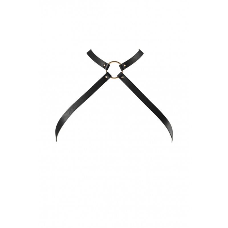 Uprząż skomponowana ze skóropodobnych pasków marki Bijoux Indiscrets. Paski krzyżują się na wysokości klatki piersiowej, pięknie i seksownie uwydatniając biust. Artykuł pochodzi z kolekcji MAZE na sezon jesień / zima 2017.