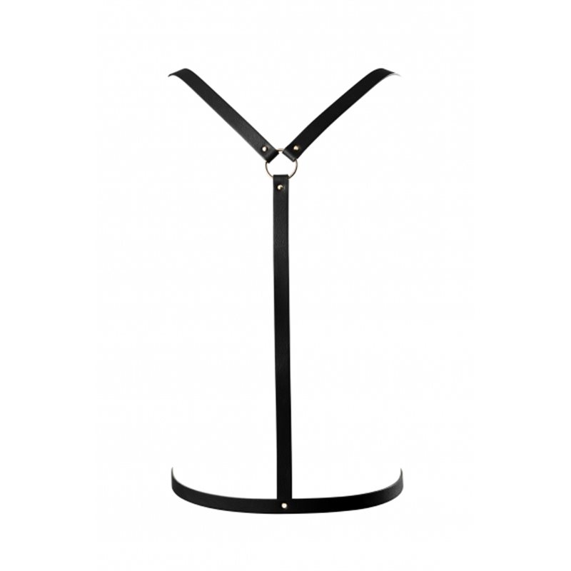 Uprząż skomponowana ze skóropodobnych pasków marki Bijoux Indiscrets. Ten model oplata talię oraz szyję i posiada łączenie z przodu za pomocą pojedynczego paska, tworząc wzór w kształcie litery "Y". Artykuł pochodzi z kolekcji MAZE na sezon jesień / zima 2017.