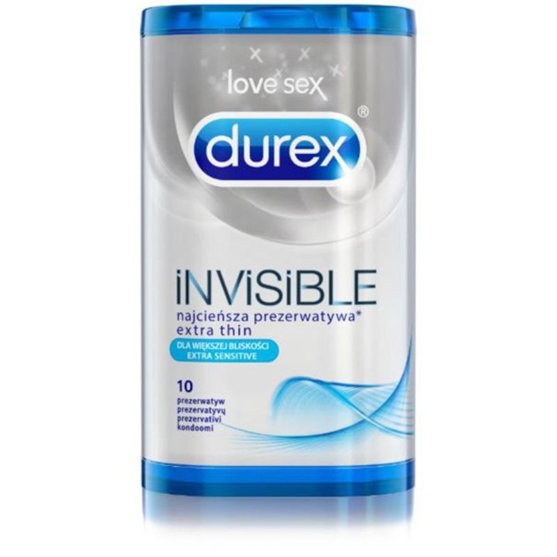 Nowe prezerwatywy Durex Invisible dla większej bliskości są 35% cieńsze od standardowych prezerwatyw Durex dla zwiększonego odczuwania i bliższego kontaktu z partnerem. Jest to najcieńsza, lateksowa prezerwatywa Durex!
