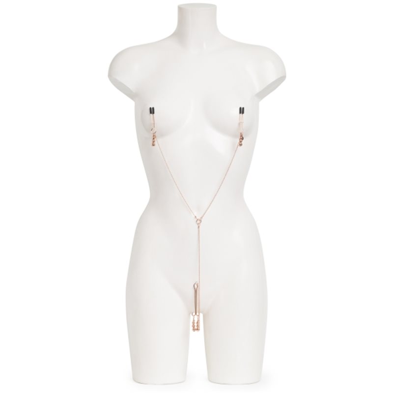 Klamerki na stutki oraz klamerki na łechtaczkę pochodzące z oficjalnej kolekcji Fifty Shades Freed. Jest to wyjątkowy gadżet, umożliwiający przeżycie niezapomnianych wrażeń niczym bohaterowie bestsellerowej powieści E.L. James. Klamerki połączone są ze sobą eleganckim łańcuszkiem w kolorze złotym. Klamerki powodują ucisk miejsc intymnych, jednocześnie prezentując ciało w bardzo erotyczny sposób. Jest to idealny gadżet dla par, które chcą rozpocząć swoją przygodę z BDSM.