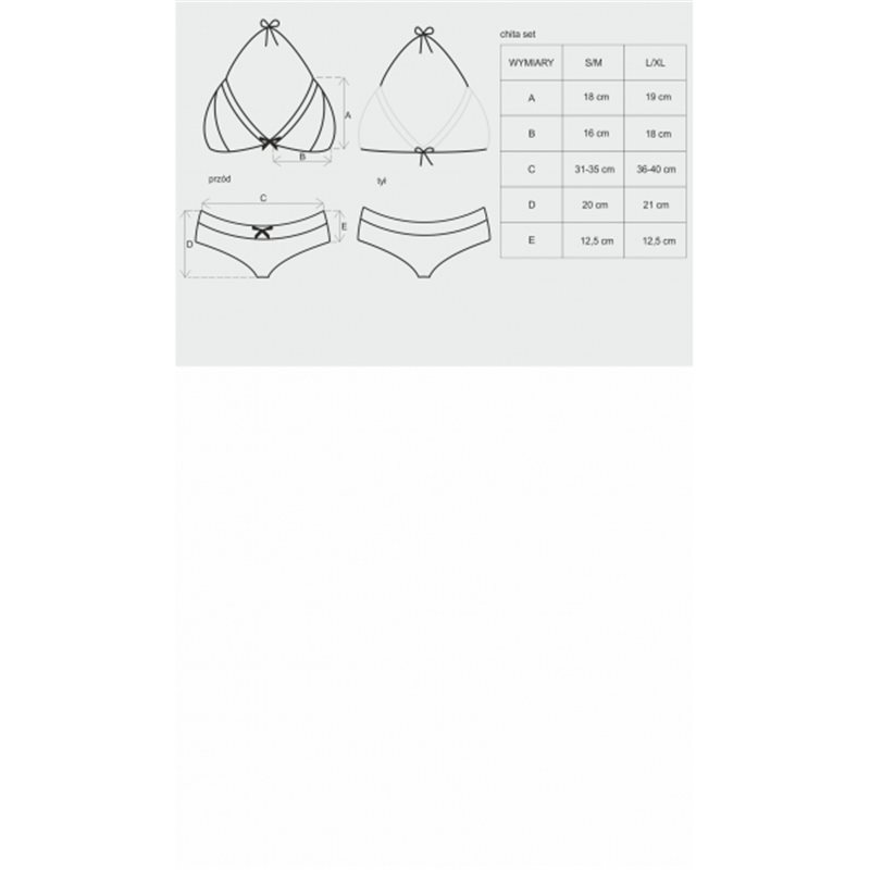 Chita komplet – szalenie seksowny komplet bielizny dla podkreślenia dzikiej strony kobiecej zmysłowości. Miękki biustonosz uszyty z półprzezroczystego materiału ozdobionego zwierzęcym wzorem posiada regulację wiązań na szyi i pod biustem. Na komplet składają się także szorty typu brazyliany wykonane z tego samego rodzaju materiału. Zarówno brzegi biustonosza jak i majteczek są obszyte kontrastującą lamówką także o lamparcim motywie. Dodatkową ozdobą kompletu są dwie satynowe kokardki w kolorze intensywnego różu umieszczone z przodu bielizny.