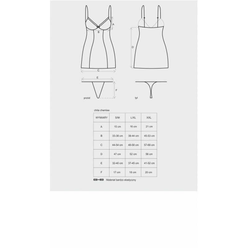 Chita chemise – zmysłowa koszulka na ramiączkach o drapieżnym charakterze. Uszyta z dwóch rodzajów materiału – gładkiego, prześwitującego po bokach i półprzezroczystego na brzuchu ozdobionego zwierzęcym motywem. Kształt miseczek także uszytych z panterkowej tkaniny eksponuje dekolt, a fiszbiny trzymają biust na miejscu. Między piersiami wzrok przyciąga intensywnie amarantowa kokardka. Brzegi Chity wykończone są kontrastującą lamówką o lamparcim wzorze. Komplet nie byłby pełen, gdyby nie dołączone do kompletu gładkie. Ponad to Chita posiada regulowane ramiączka, co ułatwia jej dopasowanie do ciała.