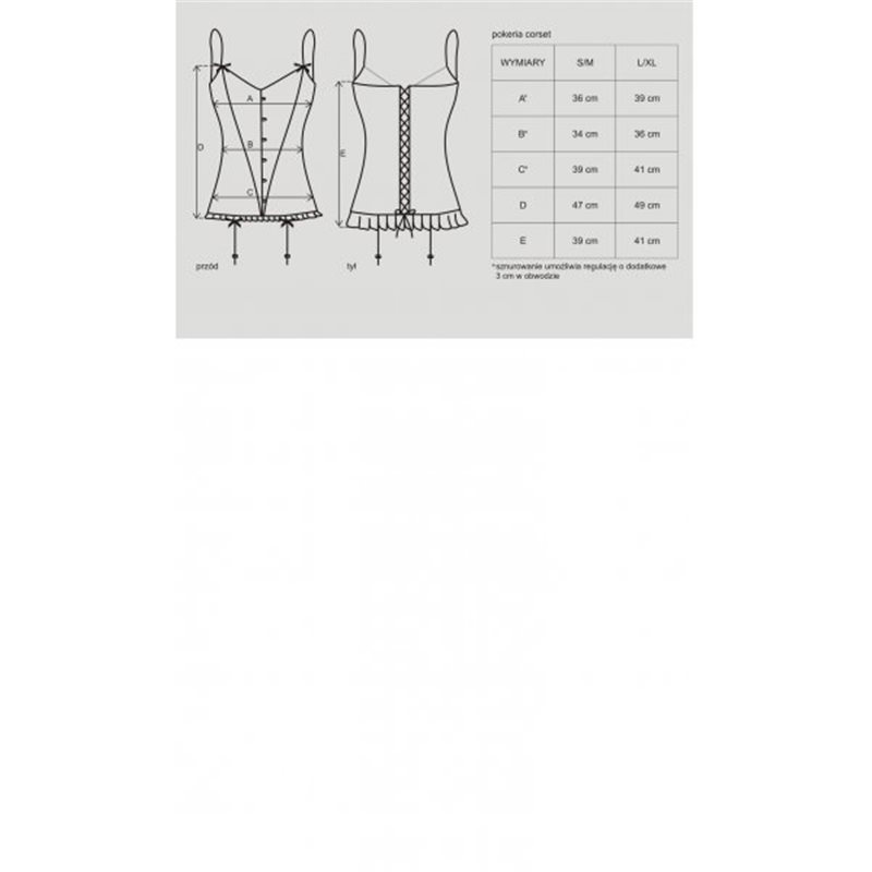 Pokeria gorset – romantyczny gorset modelujący na fiszbinach zapinany na metalowe buski. Wykonany jest w całości z grubej, nieprzezroczystej tkaniny w kolorze intensywnej czerni, z kontrastującą, ognistoczerwoną wstawką pokrytą motywem serduszek. Brzegi gorsetu wykończone są prostą, lamówkową falbaną. Dodatkowo uroku dodają czerwone kokardki umieszczone na złączeniu gorsetu z paskami oraz ramiączkami. Pionowe fiszbiny modelują sylwetkę zaznaczając talię i podnosząc piersi, a sznurowanie z tyłu pozwala na precyzyjne dopasowanie bielizny. Do kompletu dołączone są eleganckie, półprzezroczyste stringi.