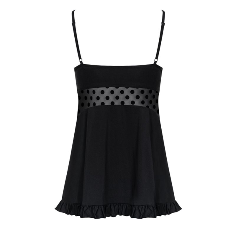 - przód babydoll wykonany z siateczki pokrytej drobnymi, miękkimi zdobieniami oraz obszyty delikatną falbanką
