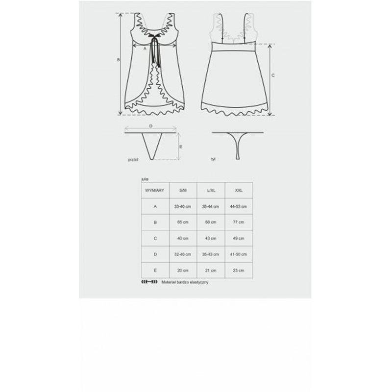 Urocza koszulka typu babydoll uszyta w całości z luksusowej mięciutkiej koronki. Brzego koszulki oraz szelki obszyte szeroką koronkową falbanką. Miseczki dla zapewniania pełnego komfortu są podszyte delikatna tkaniną a dzięki fiszbinom ładnie uwydatniają biust. Koszulka z przodu jest zapinana na haftkę i wiązana szeroką wstążką, dzięki czemu bardzo łatwo można ją zdjąć. Doskonała propozycja na noc poślubną oraz dla wszytkich kobiet, które cenią sobie luksus w przystepnej cenie.