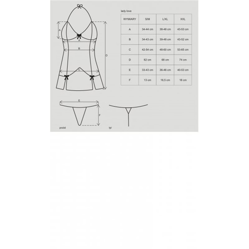 Szykowna haleczka na cienkich ramiączkach, wykonana z delikatnego materiału, ozdobiona na miseczkach i spodzie czarną gipiurą z czerwonymi aplikacjami. Odcięty staniczek ładnie eksponuje biust. Całość dopełniają zmysłowe rozcięcia na dole haleczki, które optycznie wysmuklają nogi. W komplecie stringi.