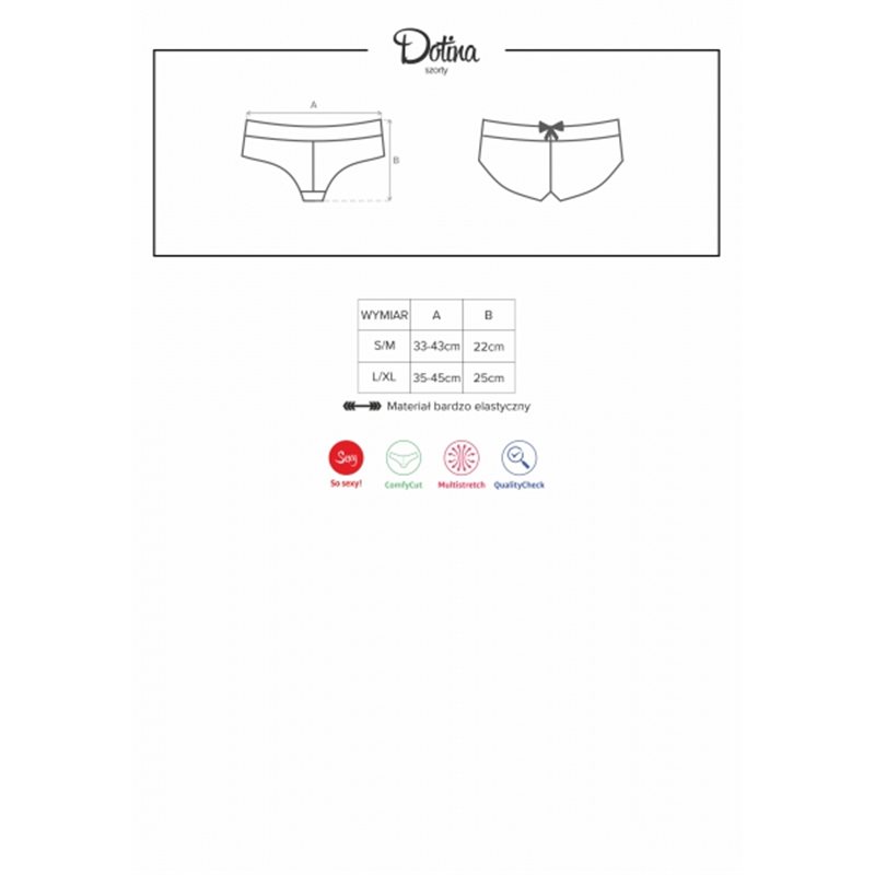 Twoje pośladki w jeszcze bardziej kuszącym wydaniu? Z seksownymi szortami Dotina będzie dokładnie tak jak chcesz – seksownie i powabnie. Rozpocznij zmysłowy, nocny pokaz prawdziwego wdzięku. Uwiedź swojego ukochanego delikatną siateczką, kokieteryjnymi kropeczkami i figlarną kokardką!