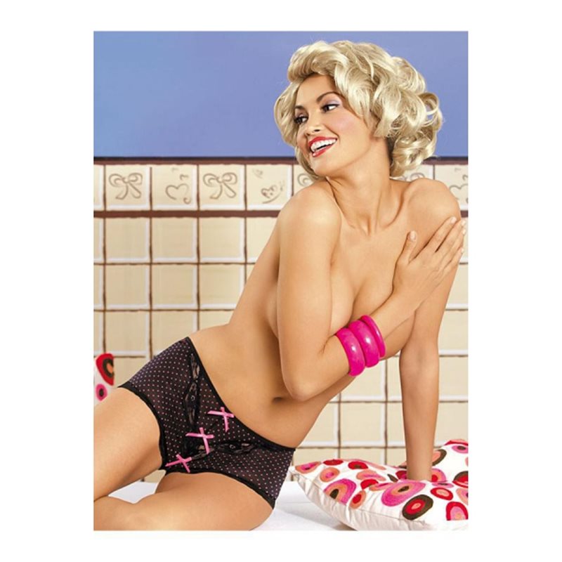 Majteczki Shortie wykonane w całości z lekko prześwitującego materiału o motywie drobnych, różowych kropeczek fantastycznie podkreślają kobiecy kształt. Ukośny układ filigranowych koronek na biodrach podkreśla kobiece proporcje, a szereg satynowych kokardek pośrodku dodaje bieliźnie lekkości