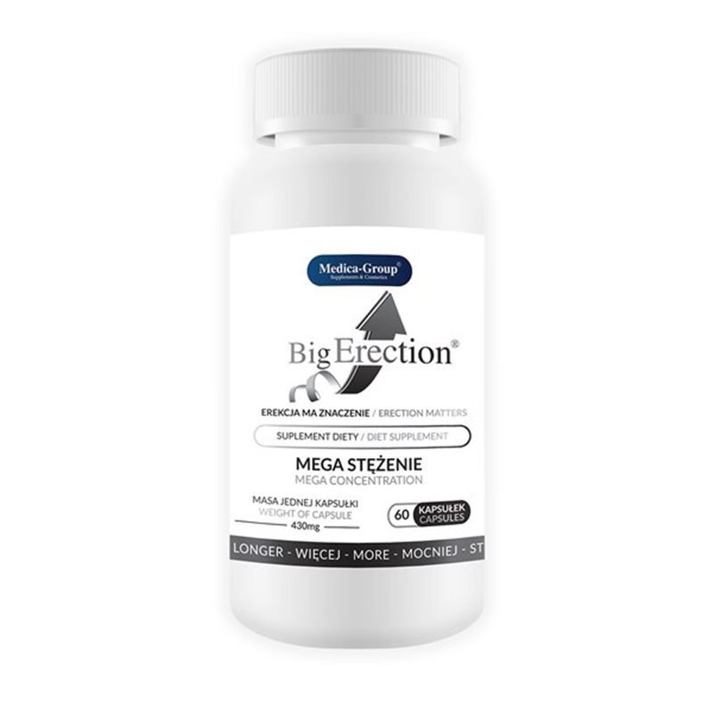 BigErection to suplement diety wzmacniający erekcję penisa. Mega Mocne stężenie - nawet 20:1. Opakowanie zawiera 60 kapsułek.