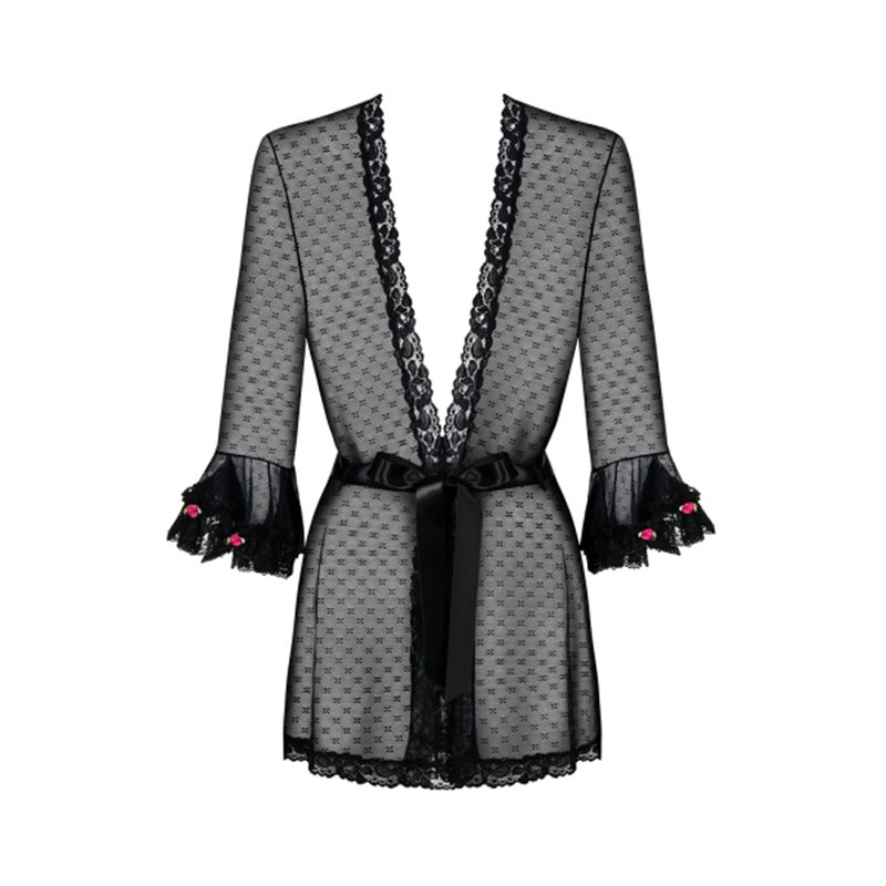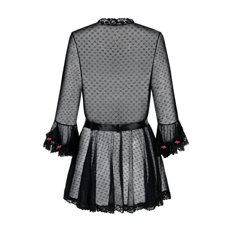 - elegancki, prześwitujący, czarny szlafroczek z motywem różyczek