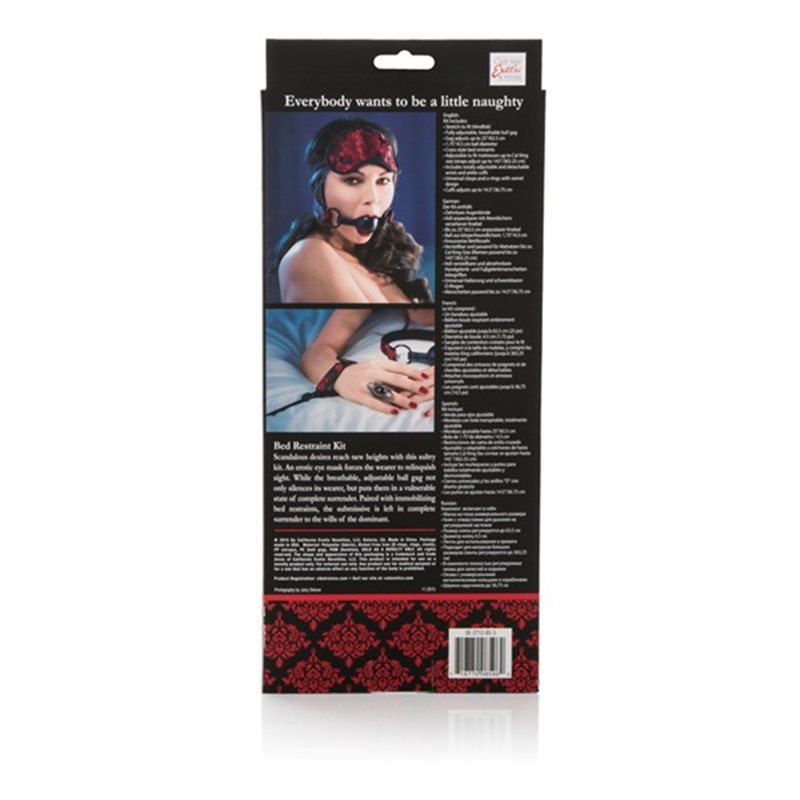 Scandal bed restraint kit – zmysłowy zestaw akcesoriów BDSM z uwodzicielskiej serii Scandal. Kara czy nagroda? Kajdanki o zapinane na rzepy ograniczą ruchliwość strony uległej. Cztery połączone pod materacem lub pod łóżkiem pasy umożliwiają unieruchomienie w stosunku do łóżka pozwalając na pełną kontrolę pozycji. Dodatkowo knebel z dziurkami dla przepływu powietrza eliminując podstawową formę komunikacji między Dominującym a Uległym pozwoli nawiązać dużo bardziej intymną więź niż przy pełnych możliwościach porozumienia się. W komplecie znajdziesz także satynową opaskę na oczy na gumkę.