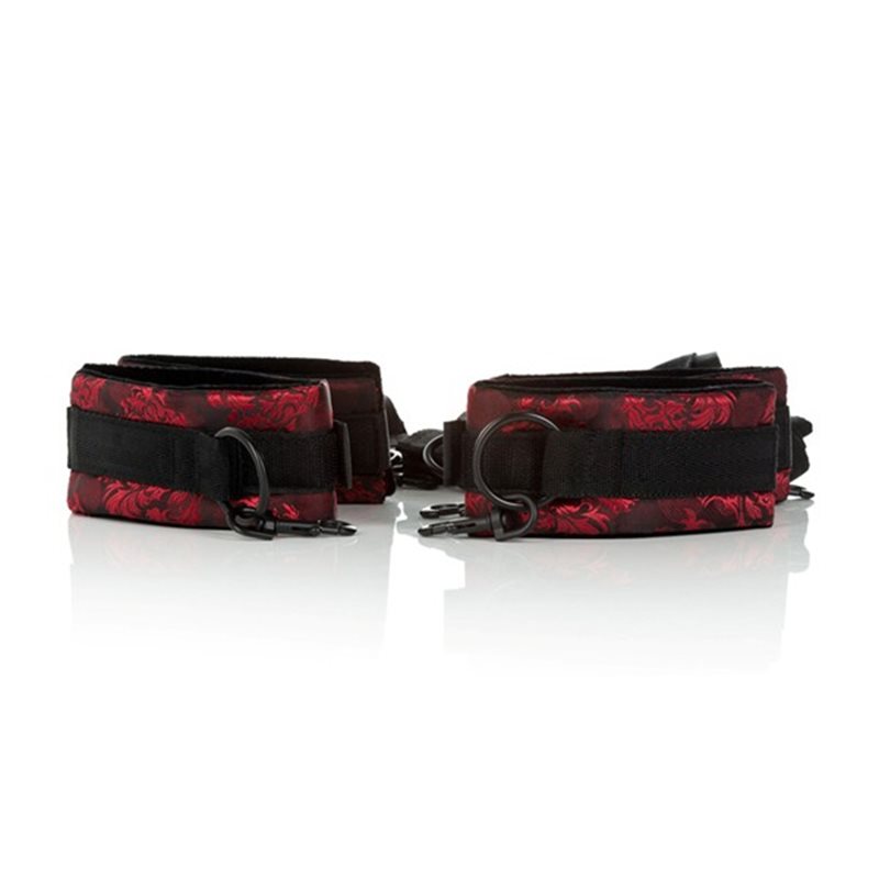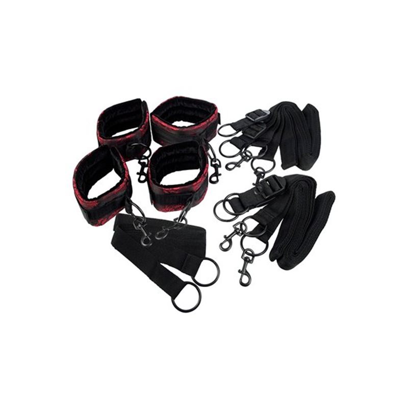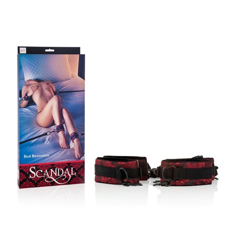 Scandal bed restraints – system kajdanek z możliwością przypięcia do łóżka z uwodzicielskiej serii Scandal. Kara czy nagroda? Kajdanki o zapinane na rzepy ograniczą ruchliwość strony uległej. Cztery poziome pasy połączone pod materacem lub pod łóżkiem pionowym pasek umożliwiają unieruchomienie w stosunku do łóżka pozwalając na pełną kontrolę pozycji. Dodatkowo każdy pas posiada regulację długości. Wszystkie cztery bransolety o szerokim zakresie regulacji zakończone są karabińczykami, co pozwala używać ich także z innymi akcesoriami z serii Scandal. Przykładowo założone na nogi umożliwiają założenie rozpórki.