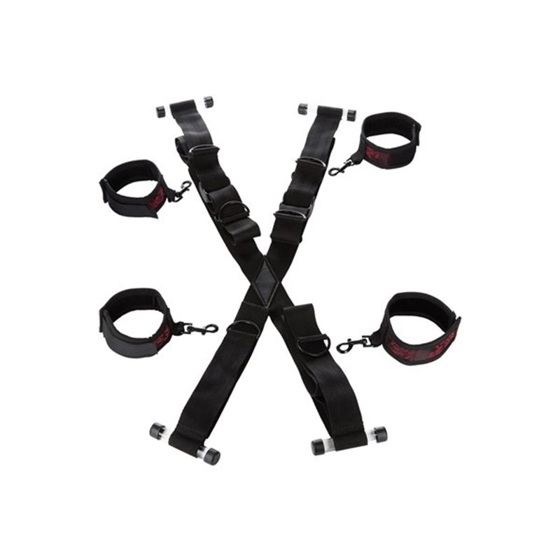 Scandal over the door cross – system kajdanek z możliwością przypięcia do drzwi z uwodzicielskiej serii Scandal. Kara czy nagroda? Miękko wykończone kajdanki zapinane na rzepy ograniczą ruchliwość strony uległej. Krzyżujące się pasy zakończone na czterech końcach blokadami umożliwiającą unieruchomienie przy drzwiach pozwalając na pełną kontrolę pozycji. Dodatkowo górna część posiada dwie wysokości przypięcia rąk do wyboru. Wszystkie cztery bransolety zakończone są karabińczykami, co pozwala używać ich także z innymi akcesoriami z serii Scandal. Przykładowo założone na nogi umożliwiają założenie rozpórki.