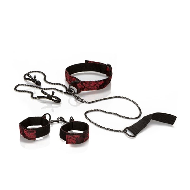 Scandal submissive kit – zmysłowy zestaw z uwodzicielskiej serii Scandal. Regulowana, cienka obróżka z metalowym zaczepem stanowi bazę do przyczepienia krótkiej smyczy oraz klamerek na sutki. Oba elementy można przypiąć do obroży za pomocą cienkich łańcuszków. Zaciski na sutki o bardzo precyzyjnej regulacji zacisku zakończone są miękkim silikonem zapobiegającym podrażnieniom sutków. Karabińczyki na każdej z bransolet kajdanek pozwalają na przypięcie ich innych akcesoriów z rodziny Scandal. Zakładając bransolety na nogi możesz przymocować je do rozpórki. W komplecie znajdziesz także ozdobną opaskę na oczy na gumkę.