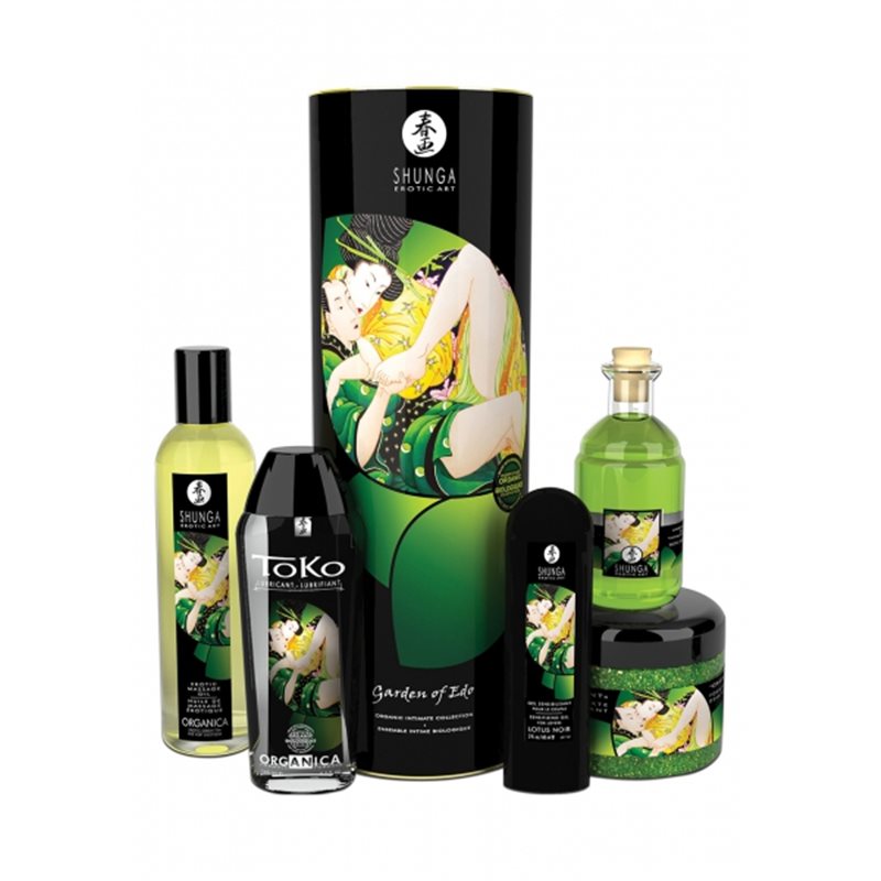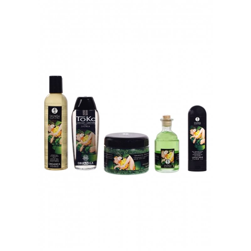 Zestaw marki Shunga, w skład którego wchodzą: organiczne olejki o zapachu zielonej herbaty (jeden do masażu, drugi do miejsc intymnych), organiczny lubrykant TOKO, żel zwiększający siłę doznań seksualnych dla par Lotus Noir oraz sól z morza martwego do kąpieli o zapachu kwiatu lotosu.
