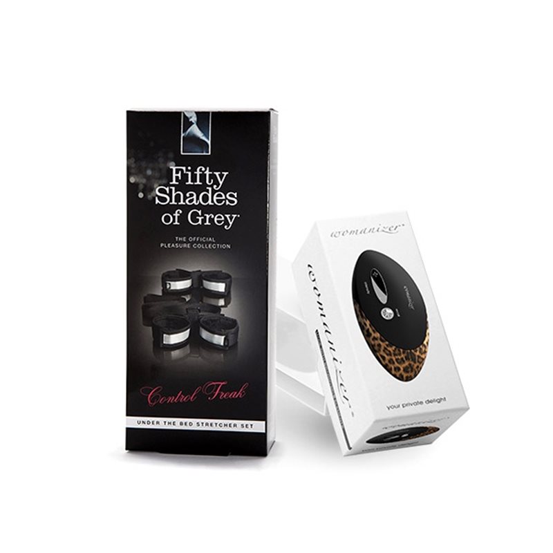 Limitowana edycja "Fifty Shades of Grey" oprócz stymulatora łechtaczki Womanizer W500 Pro w kolorze czarnym, zawiera zestaw do krępowania rąk i nóg z oficjalnej kolekcji nawiązującej do kultowej serii książkowej o Christianie Greyu.