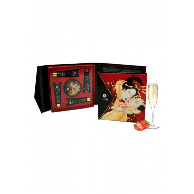 Zestaw marki Shunga do masażu erotycznego o smaku musującego wina truskawkowego.